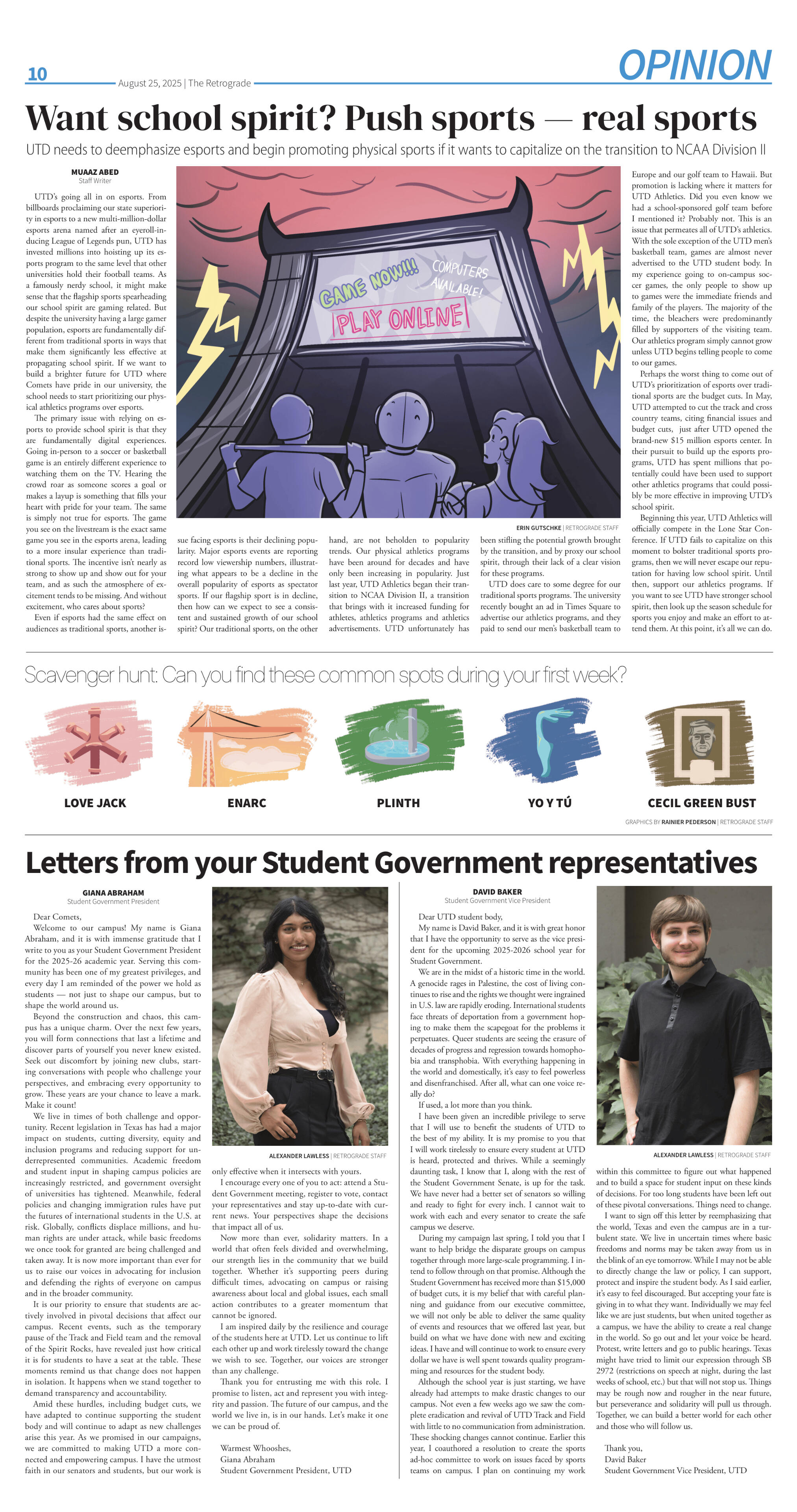 I have contributed to several of the campus print publications at UT Dallas.The Mercury is UTD's student newspaper. I worked as a contributing graphic artist from Fall 2023 to Spring 2024, as the Social Media Manager in Spring 2024, and as the Graphics Editor from May 2024 to September 2024. The Mercury is available in print & online, and is generally published every two weeks on Mondays during long semesters.The Retrograde is UTD's independent student newspaper, formed after The Mercury went on strike in Fall 2024. I started working as the Graphics Editor in September 2024; alongside my duties in overseeing the graphics department, I formed the publication's branding identity by designing the logo, color scheming, and letterhead for the print publication. The Retrograde is available in print and online, and is generally published every two weeks online; print publication usually occurs once a month, depending on funding.AMP is UTD's student-run opinion and satire magazine. I have worked as a contributing artist since Fall 2023. AMP is generally published once a month during long semesters, and is available in print & online.(Scroll down or click on the buttons to jump to the corresponding sections.)