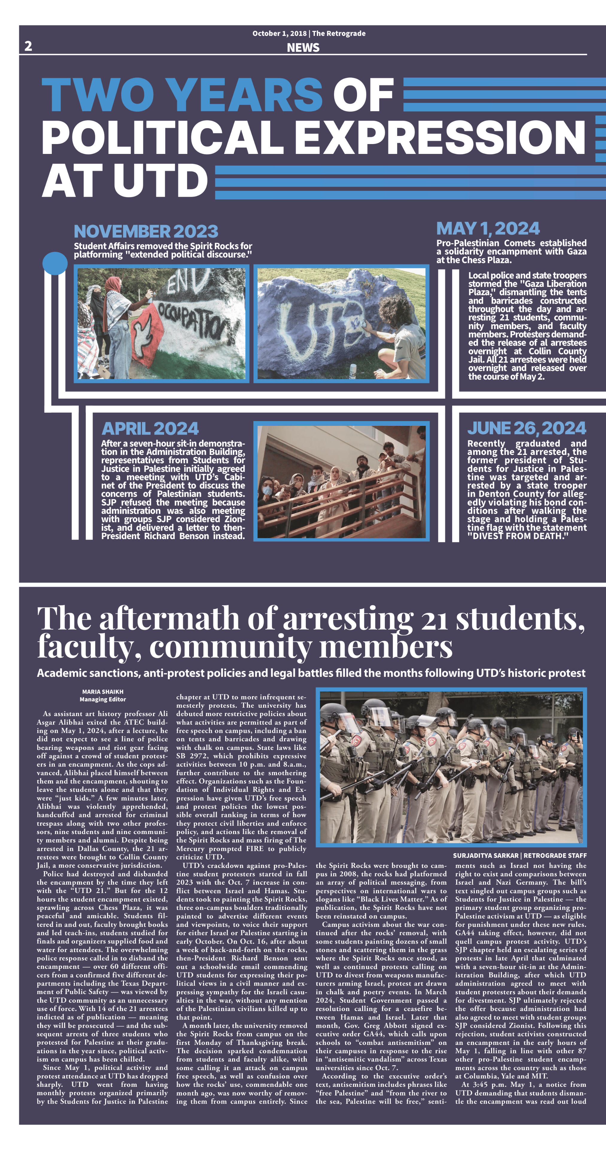 Racheeti, K. & Sultana, A. (2024, September 3). Manny Jacinto Deserves Better Than a Canceled Show. The Mercury, 19(2), 10. archive.org/details/09.03.24-combined-paper/page/10/mode/2upAggarwal, A. & Sultana, A. (2024, September 3). Fighting Pain Through The Gut Microbiome. The Mercury, 19(2), 3. archive.org/details/09.03.24-combined-paper/page/2/mode/2upStudent X & Sultana, A. (2024, August 19). Sanctions, Reflections. The Mercury, 19(1), 10-11. archive.org/details/TheMercury08.19.24/page/10/mode/2upOlogban, M. & Sultana, A. (2024, August 19). ATEEZ Blazes with Theatrical Performance. The Mercury, 19(1), 7. archive.org/details/TheMercury08.19.24/page/6/mode/2upGutierrez, G. & Sultana, A. (2024, August 19). Students Arrested May 1 Face Denial of Degree, Deferred Suspension, Continued Legal Charges. The Mercury, 19(1), 1. archive.org/details/TheMercury08.19.24UTD Students for Justice in Palestine & Sultana, A. (2024, July 15). Opinion: University Administration, Police Target Palestinian UTD Alum. The Mercury, 18(20), 11. archive.org/details/07-15-24-paper-final/page/10/mode/2upRacheeti, K. & Sultana, A. (2024, July 15). ‘A Giant Among Men.’ The Mercury, 18(20), 3-5. archive.org/details/07-15-24-paper-final/page/2/mode/2upGutierrez, G. & Sultana, A. (2024, July 15). The Mercury Faces Over $8,500 Fee. The Mercury, 18(20), 4. archive.org/details/07-15-24-paper-final/page/4/mode/2upGutierrez, G. & Martinez, P. & Racheeti, K. & Shaikh, M. & Sultana, A. (2024, July 15). Editorial: Investigative Journalism at Stake — Support The Mercury. The Mercury, 18(20), 12. archive.org/details/07-15-24-paper-final/page/12/mode/2upGutierrez, G. & Sultana, A. (2024, May 20). 'They are Just Kids!' The Mercury, 18(19), 6. archive.org/details/the-mercury-05-20-24/page/n5/mode/2upGutierrez, G. & Martinez, P. & Racheeti, K. & Shaikh, M. & Sultana, A. (2024, May 20). Despite Administration’s Silence, Community Supports 21 Arrested at ‘Gaza Liberation Plaza.’ The Mercury, 18(19), 2-3. archive.org/details/the-mercury-05-20-24/page/n1/mode/2upSultana, A. (2024, May 13). From the Ground: Gaza Liberation Plaza. The Mercury, utdmercury.com/from-the-ground-gaza-liberation-plaza/Gutierrez, G. & Shaikh, M. & Pederson, R. & Sultana, A. (2024, May 2). Collin County Jail Releases Detained Protesters, Families Rejoice. The Mercury, 18(19), 5. utdmercury.com/collin-county-jail-releases-detained-protesters-families-rejoice/Gutierrez, G. & Shaikh, M. & Sultana, A. (2024, May 2). Comets, Community Members Demand Return of 21 Individuals Detained Overnight at Collin County Jail. The Mercury, 18(19), 5. utdmercury.com/comets-community-members-demand-return-of-21-individuals-detained-overnight-at-collin-county-jail//Averion, A. & Gutierrez, G. & Sierputowski, J. & Shaikh, M. & Sultana, A. (2024, May 1). Comets Create Encampment in Solidarity with Gaza. The Mercury, 18(19), 4. utdmercury.com/comets-create-encampment-in-solidarity-with-gaza/Gutierrez, G. & Sultana, A. (2024, April 29). The Protester’s Polemic. The Mercury, 18(18), 10. archive.org/details/combinepdf_202404/page/n9/mode/2up/Gutierrez, G. & Sultana, A. (2024, April 1). Abbott’s Age Verification Order Spells Internet Doom. The Mercury, 18(16), 12. archive.org/details/newspaper-04.01.2024/page/12/mode/2up/Racheeti, K. & Sultana, A. (2024, February 26). Comets' Critical Critique of Cinema. The Mercury, 18(14), 8. archive.org/details/real-newspaper-02.26.24/page/n7/mode/2up/Shaikh, M. & Sultana, A. (2024, February 12). Hating Furries Proves You're Uneducated. The Mercury, 18(13), 16. archive.org/details/the-mercury-02-12-24/page/16/mode/2up/Racheeti, K. & Sultana, A. (2024, January 29). New Year, New Classes – But Don’t Drop Old Friends. The Mercury, 18(12), 12. archive.org/details/the-mercury-01-29-24/page/12/mode/2up/Gutierrez, G. & Sultana, A. (2024, January 16). Diversity, ODEI Removed: Trans Students React. The Mercury, 18(11), 1. archive.org/details/01.16.24-newspaper/Grandhe, N. & Sultana, A. (2024, January 16). Diversity, Equity and Inclusion Replaced with OCRS. The Mercury, 18(11), 1. archive.org/details/01.16.24-newspaper/Shaikh, M. & Azeem, F. & Sierputowski, J. & Gutierrez, G. & Nguyen, M. & Sultana, A. (2023, December 4). Bring Our Rocks Back! The Mercury, 18(10), 16. archive.org/details/12-04-23-newspaper/page/n15/mode/2up/Sultana, A. (2023, December 4). Editorial Cartoon. The Mercury, 18(10), 15. archive.org/details/12-04-23-newspaper/page/14/mode/2up/Sultana, A. (2023, November 13). Editorial Cartoon. The Mercury, 18(9), 12.