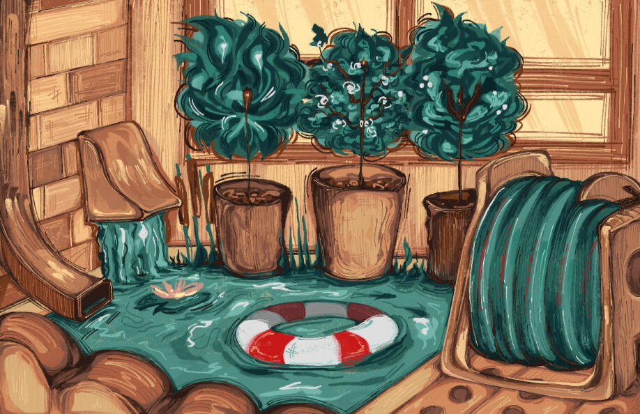I Wish I Had a Pool (2023) was made using digital media (Clip Studio Paint). This piece is 11 x 17 inches.("Ecotone is a term from the field of ecology that describes the area where two different habitat types or communities come together. They are areas of steep transition between ecological communities, ecosystems, or ecological regions. Ecotones occur at multiple spatial scales and range from natural boundaries to human-generated ecotones. Various studies have shown that species richness and abundances tend to peak in ecotonal areas, though exceptions to these patterns occur. Recent evidence suggests that ecotones may also be speciation centers. Some researchers argue that ecotones deserve high conservation investment, potentially serving as speciation and biodiversity centers. Because ecotones are often small in size and relatively rich in biodiversity, their conservation may be cost effective.")